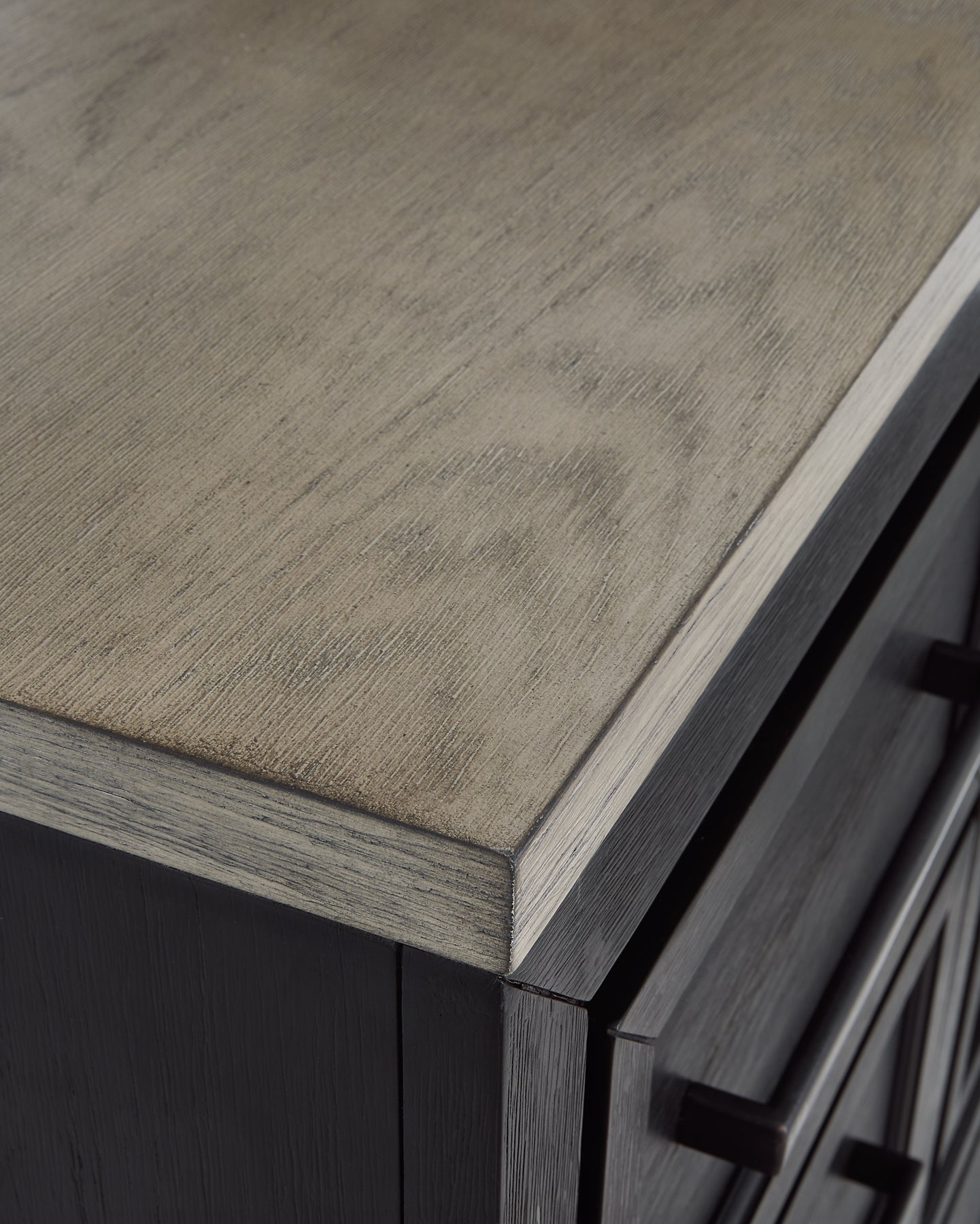 Details B989B5: Includes California king panel headboard, storage footboard, and rails with roll slats, Made with hardwood solids, select oak veneers and engineered wood, Two-tone finish (brushed black and dusty grayish brown wood tone), Headboard with picture frame moulding, Footboard with two deep drawers, Smooth-gliding soft-close drawers with fully finished interiors and dovetail construction, Sleek drawer pulls with black finish, Bed does not require additional foundation/box spring; accommodates most zero clearance adjustable bases with the addition of a bunkie board, Mattress available, sold separately, Assembly required, B989B1: Includes dresser and mirror, Made with hardwood solids, select oak veneers and engineered wood, Two-tone finish (brushed black and dusty grayish brown wood tone), Sleek drawer pulls with black finish, 11 soft-close, smooth-gliding drawers with fully finished interiors and dovetail construction (top drawers felt lined), 5 drawers with brushed black finish; 6 drawers with grayish brown wood tone, 3 drawers located behind each door, Mirror mounts to back of dresser, Assembly required, B989-48: Made with hardwood solids, select oak veneers and engineered wood, Two-tone finish (brushed black and dusty grayish brown wood tone), Sleek drawer pulls with black finish, 5 soft-close, smooth-gliding drawers with fully finished interiors and dovetail construction (top drawers felt lined), 3 pull-out trays (felt lined) and 2 adjustable shelves behind door, B989-92: Made with hardwood solids, select oak veneers and engineered wood, Two-tone finish (brushed black and dusty grayish brown wood tone), Sleek drawer pulls with black finish, 2 soft-close, smooth-gliding drawers with fully finished interiors and dovetail construction, 110V power supply with dual USB charging port, Power cord included; UL listed,