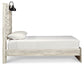 Details Includes headboard, footboard and rails, Made of engineered wood (MDF/particleboard) and decorative laminate, Wispy white finish over replicated oak grain with authentic touch, 2 decorative sconce lights, LED with 3 AA batteries, 2 slim-profile USB charging ports, Power cord included; UL-listed, Foundation/box spring required, sold separately, Mattress available, sold separately, Assembly required, Bed is compatible with an adjustable base
